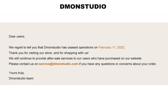 Dmonstudio網(wǎng)站主頁(yè)刊登的致消費者的公告顯示,Dmonstudio已于2022年2月11日停止運營(yíng),但已經(jīng)在網(wǎng)站上購買(mǎi)了商品的消費者,可以繼續享受售后服務(wù)。如果消費者對訂單有任何疑問(wèn),都可以通過(guò)郵件聯(lián)系到Dmonstudio團隊。