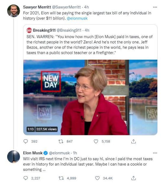 有網(wǎng)友在Twitter上發(fā)文表示,馬斯克在2021年繳稅超110億美元,創(chuàng )造歷史新高。