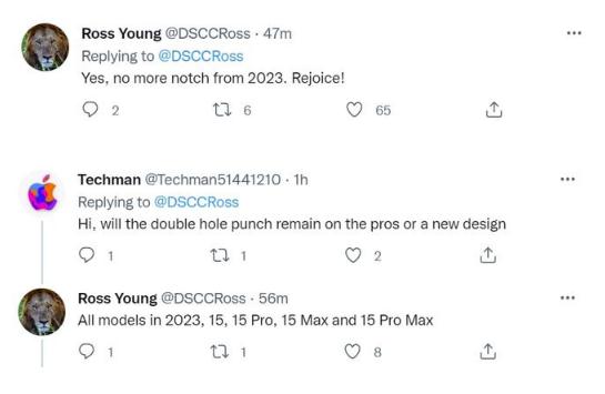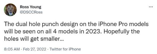 顯示器行業(yè)分析師Ross Young通過(guò)Twitter表示,iPhone Pro機型的“雙打孔”設計將在2023年的4款機型上全部出現。
