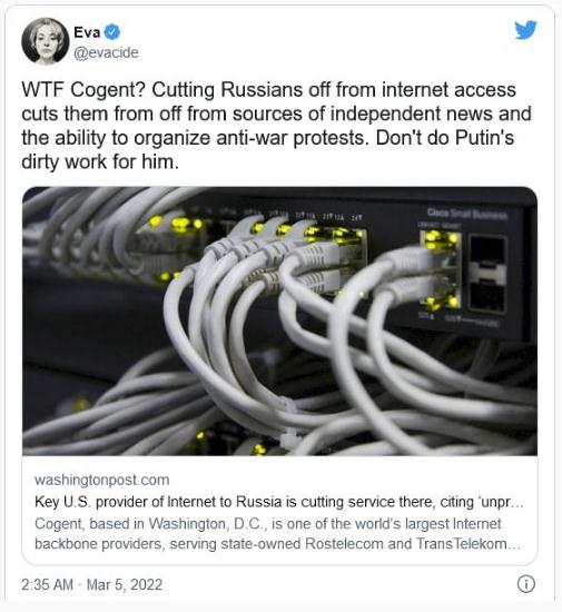 Cogent 公司稱(chēng),終止合同是為了維持對最近通過(guò)的歐盟 2022/350 號條例的遵守,此舉是為了抑制俄羅斯對烏克蘭及其盟友進(jìn)行宣傳和網(wǎng)絡(luò )攻擊的能力。