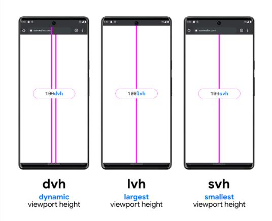 新的視窗單位考慮包含標題欄的布局,引入了最大、最小和動(dòng)態(tài)視窗單位,比如 100svh 指 100% 最小可能視窗高度,100lvh 指 100% 最大可能視窗高度,100dvh 指 100% 動(dòng)態(tài)視窗高度——該值將隨著(zhù)用戶(hù)滾動(dòng)而改變。