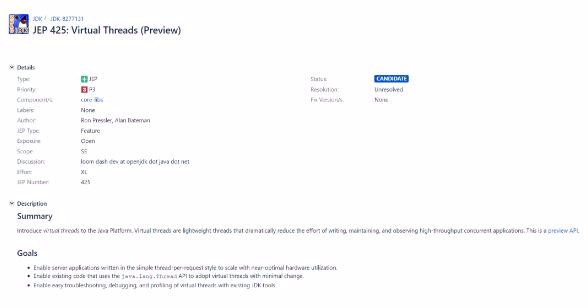 有關(guān)虛擬線(xiàn)程的更多信息可在 OpenJDK 的 JDK Issue-8277131 中查看,目前該提案于 2021/11/15 創(chuàng )立,目前還處于 JEP 流程的第一階段,距離穩定版本還需要一段時(shí)間。