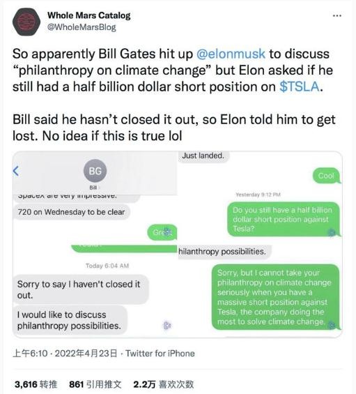 馬斯克:對不起,當你還持有大量特斯拉空頭頭寸時(shí),我沒(méi)法認真對待你在氣候變化方面的慈善事業(yè),畢竟特斯拉在解決氣候變化方面做得最多。
