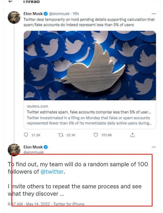 特斯拉 CEO 埃隆·馬斯克在其 13 日宣布擱置收購推特的推文下方補充稱(chēng):為了找到答案,將隨機抽取 100 名推特粉絲。同時(shí)還會(huì )邀請其他人進(jìn)行同樣的操作,看看他們會(huì )發(fā)現什么。