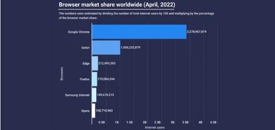 雖然 Safari 擁有超過(guò) 10 億用戶(hù),但谷歌 Chrome 的用戶(hù)數量是其三倍,總用戶(hù)量為 3,378,967,819。