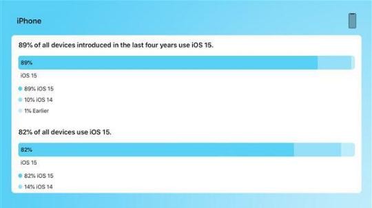 為了迎接即將到來(lái)的 iOS 16,蘋(píng)果更新了 iOS 15 普及率數據,上次更新還是今年 1 月。5 個(gè)月過(guò)去了,在過(guò)去四年推出的設備中,iOS 15 的普及率達 89%,iOS 14 的普及率仍然有 10%,1% 為較早版本。