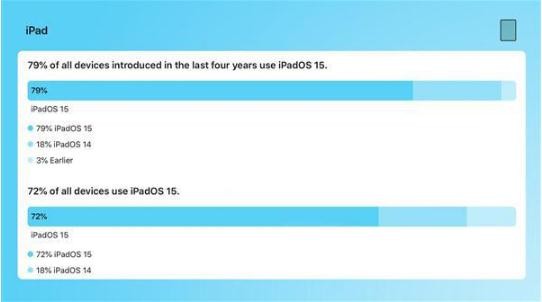 在 iPad 方面,在過(guò)去四年推出的設備中,iPadOS 15 的普及率達 79%。18% 仍然使用 iPadOS 14。3% 為較早版本。所有的設備中,iPadOS 15 的普及率達 72%,18% 仍然使用 iPadOS 14。10% 為較早版本。