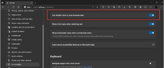 IT之家了解到,該功能默認情況下是禁用的,因此需要導航到 Edge 設置 > 輔助功能并打開(kāi)“使用雙擊關(guān)閉瀏覽器標簽頁(yè)”選項。然后,用鼠標左鍵雙擊一個(gè)標簽頁(yè),就可以將其關(guān)閉。