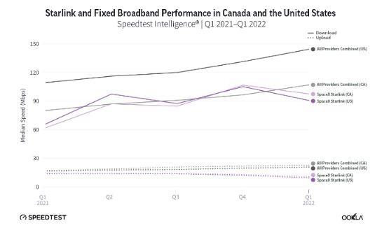 今日,網(wǎng)絡(luò )測試機構 Ookla 發(fā)布了一篇關(guān)于星鏈的報告,該報告稱(chēng),星鏈的下載速度中位值在加拿大從去年一季度的 61.84 Mbps 提高到了 97.40 Mbps(今年一季度),一年增加了近 58%,在美國從去年一季度的 65.72 Mbps 提高到 90.55 Mbps(今年一季度),一年增加了近 38%。