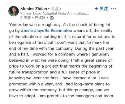 盡管被解雇了,但是許多特斯拉員工在職業(yè)社交網(wǎng)站領(lǐng)英上發(fā)帖,稱(chēng)贊他們?yōu)轳R斯克的電動(dòng)化未來(lái)愿景工作的經(jīng)歷。