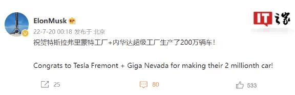 馬斯克表示 特斯拉弗里蒙特工廠(chǎng)和內華達超級工廠(chǎng)已生產(chǎn)200萬(wàn)輛車(chē) 09:56:36