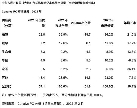 大型 PC 廠(chǎng)商也都吃到了疫情紅利,聯(lián)想在 2021 年出貨量年增長(cháng)率高達 21.5%,宏碁更是交出了 36.4% 的年增長(cháng)率數據。
