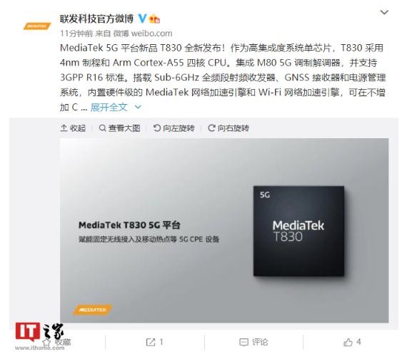 聯(lián)發(fā)科今天宣布,MediaTek 5G 平臺新品 T830 全新發(fā)布。作為高集成度系統單芯片,T830 采用 4nm 制程和 Arm Cortex-A55 四核 CPU。集成 M80 5G 調制解調器,并支持 3GPP R16 標準。