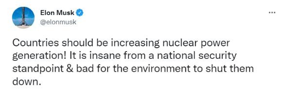 “各國應該增加核能發(fā)電!從國家安全的角度來(lái)看,關(guān)閉核電是瘋狂的,而且對環(huán)境不利。”馬斯克在推文中寫(xiě)道。