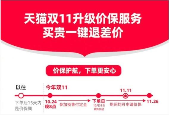 據淘寶最新消息,為了更好地保護消費者權益,今年天貓雙十一對價(jià)保規則做了升級,將原來(lái)的付款后 15 天內價(jià)保,改為 11 月 11 日活動(dòng)結束后 15 天內全程價(jià)保,最長(cháng)價(jià)保時(shí)間可以延長(cháng)至 27 天。如果小伙伴們發(fā)現,此前購買(mǎi)帶價(jià)保標識的產(chǎn)品出現降價(jià),都可以直接發(fā)起價(jià)保申請。
