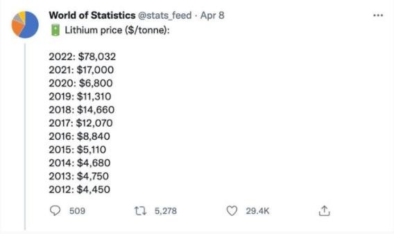 統計世界(World of Statistics)在推特上曾列出了過(guò)去 20 年每噸鋰的平均價(jià)格。自 2021 年以來(lái),全球鋰價(jià)一直大幅上漲;俄烏沖突后,鋰價(jià)更是加速飆升。
