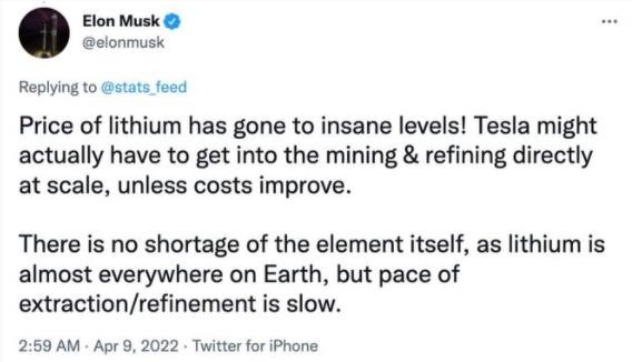 在眾多車(chē)企深受鋰價(jià)飆升的打擊之際,馬斯克率先行動(dòng)了。