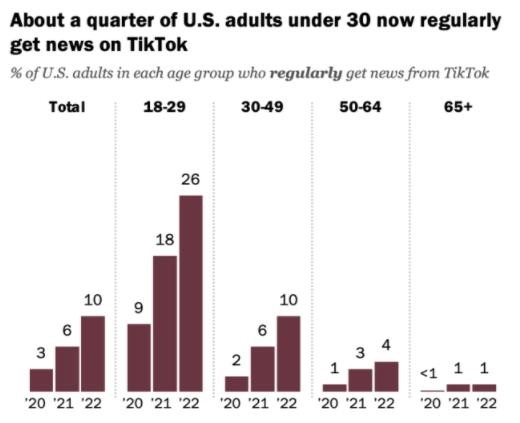 調查顯示,自 2020 年以來(lái),從 TikTok 獲取新聞的美國人比例增加了兩倍。目前,大約 10% 的美國成年人經(jīng)常通過(guò)該應用獲取新聞。在 30 歲以下的成年人中,這一比例躍升至 26%。