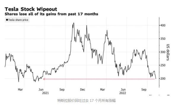 隨著(zhù)投資者在埃隆?馬斯克 (Elon Musk) 收購推特后繼續拋售特斯拉股票,特斯拉股價(jià)抹掉了過(guò)去 17 個(gè)月的所有漲幅。