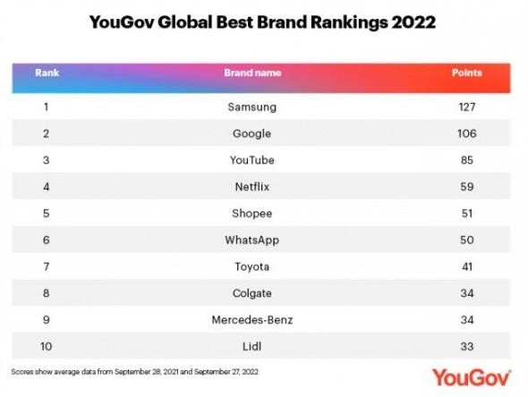 在全球民意調查公司 YouGov 評選的世界最佳品牌榜中,三星電子首次排名第一,2021 年排名第一的谷歌跌至第二位。