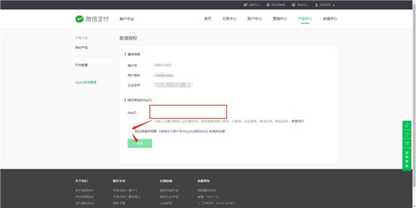 2.進(jìn)入到支付平臺之后點(diǎn)擊橫向標簽的產(chǎn)品中心,然后再點(diǎn)左側標簽的APPID賬號管理,就會(huì )看到添加關(guān)聯(lián)公眾號或小程序的AppID按鈕了。