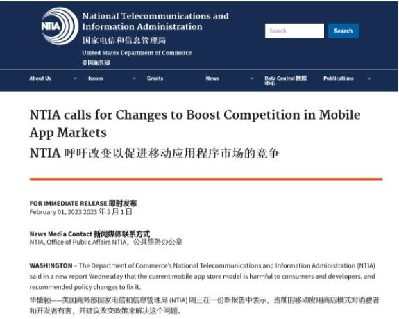 NTIA 在今天發(fā)布的《NTIA 呼吁改變以促進(jìn)移動(dòng)應用程序市場(chǎng)的競爭》公告中表示,蘋(píng)果 App Store 和谷歌 Play Store 現有的移動(dòng)應用商城模式對消費者和開(kāi)發(fā)者有害,并建議改變政策來(lái)解決這個(gè)問(wèn)題。