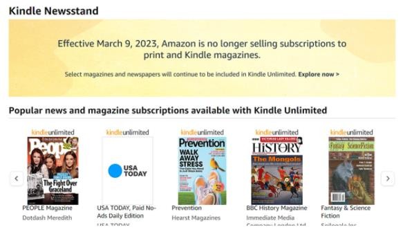 亞馬遜自 2023 年 3 月 9 日起,不再銷(xiāo)售印刷品、Kindle 雜志和報紙訂閱服務(wù)。亞馬遜當前不再接受 Kindle Newsstand 新用戶(hù)訂閱、不支持印刷雜志訂閱,現有用戶(hù)將不會(huì )自動(dòng)續訂”。