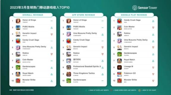 Sensor Tower 商店情報數據顯示,2023 年 3 月騰訊《王者榮耀》在全球 App Store 和 Google Play 吸金 2.15 億美元(IT之家備注:當前約 14.79 億元人民幣),蟬聯(lián)全球手游暢銷(xiāo)榜冠軍。騰訊《PUBG Mobile》(合并《和平精英》收入)排名第二,米哈游《原神》第三。