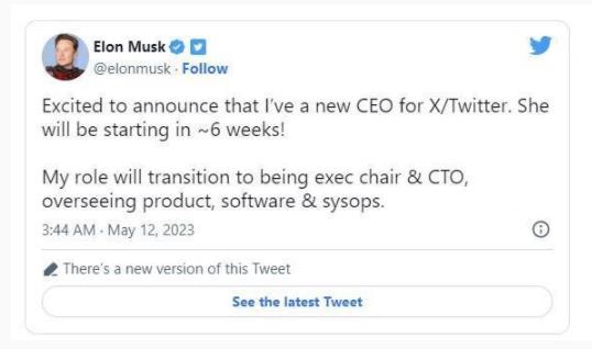 馬斯克通過(guò)推特表示:“很高興宣布,我已經(jīng)為X/推特聘請了一位新的首席執行官,她將在大約六周內開(kāi)始工作。我本人將逐漸過(guò)渡到執行主席兼首席技術(shù)官的角色,負責產(chǎn)品、軟件和系統運營(yíng)。”