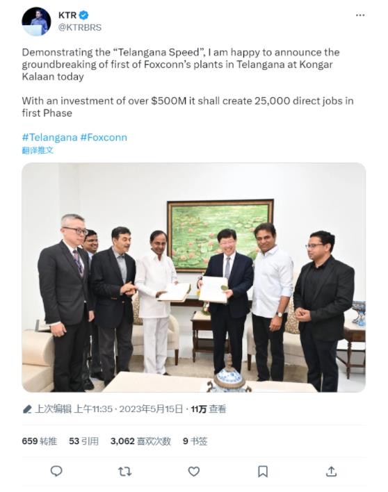 蘋(píng)果供應商富士康在在印度南部 Telangana 邦的第一家工廠(chǎng)今日破土動(dòng)工。該邦的 IT 部長(cháng)周一透露,富士康將在該地投資 5 億美元(IT之家備注:當前約 34.8 億元人民幣),將直接創(chuàng )造 25,000 個(gè)工作崗位。