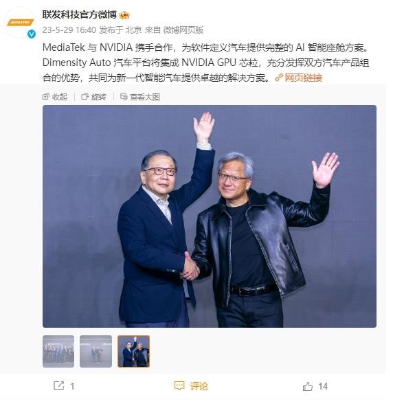 英偉達 CEO 黃仁勛與聯(lián)發(fā)科 CEO 蔡力行共同宣布雙方達成合作,二者將共同開(kāi)發(fā)車(chē)用 SoC,并將為軟件定義汽車(chē)提供完整的 AI 智能座艙方案。