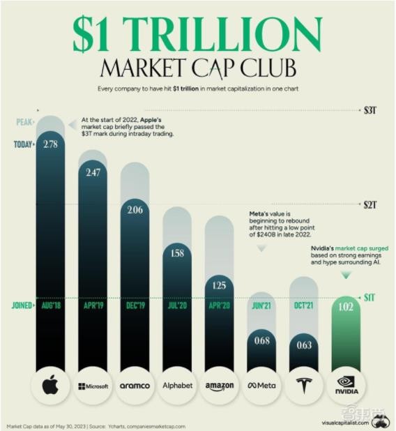 至此,英偉達成為全球第一家市值突破萬(wàn)億美元的芯片公司、全球第一家由華人創(chuàng )立的萬(wàn)億美元市值公司、第七家市值越過(guò) 1 萬(wàn)億美元的美國公司,并成為當前市值僅次于蘋(píng)果、微軟、Alphabet、亞馬遜的美股第五大科技股。