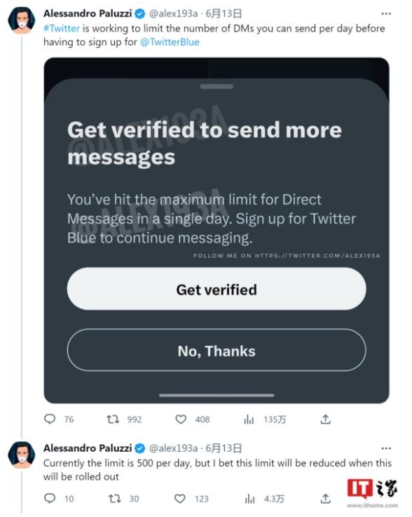 推特計劃進(jìn)一步限制普通用戶(hù)私信數量 付費用戶(hù)可無(wú)限發(fā)送 15:26:46