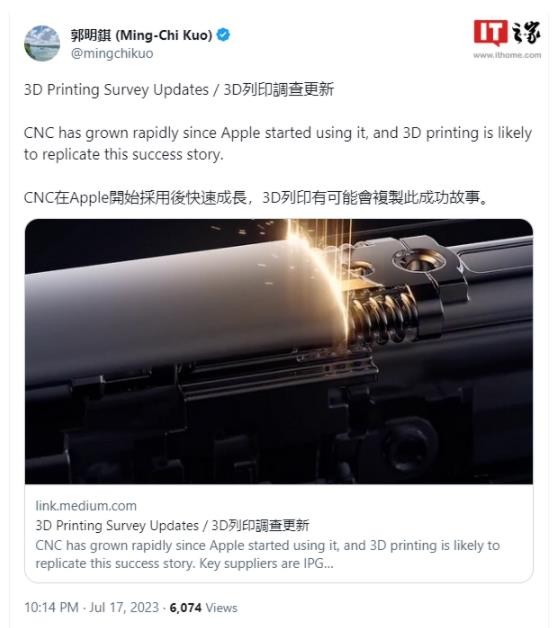 蘋(píng)果要用:郭明錤稱(chēng) 3D 打印有可能會(huì )復制 CNC 的成功故事 09:49:25