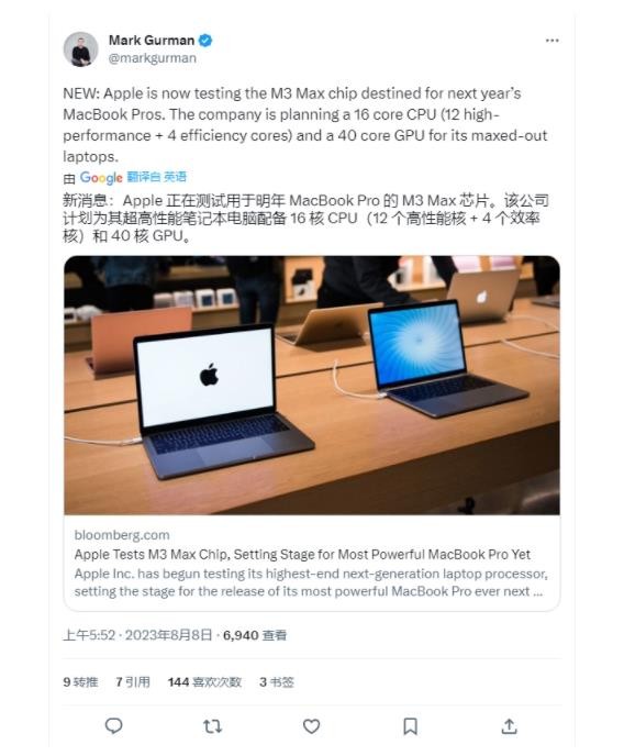 消息稱(chēng)蘋(píng)果正測試 M3 Max 芯片,搭載 16 核 CPU 和 40 核 GPU 11:25:10