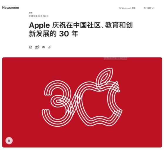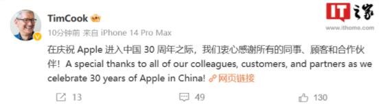 蘋(píng)果公司 CEO 蒂姆?庫克今日早間發(fā)文,慶祝蘋(píng)果進(jìn)入中國 30 周年,并表示“衷心感謝所有的同事、顧客和合作伙伴”。