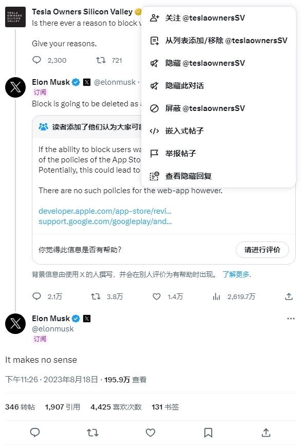 馬斯克表示將會(huì )刪除“屏蔽某人”功能 認為“毫無(wú)意義” 15:28:01