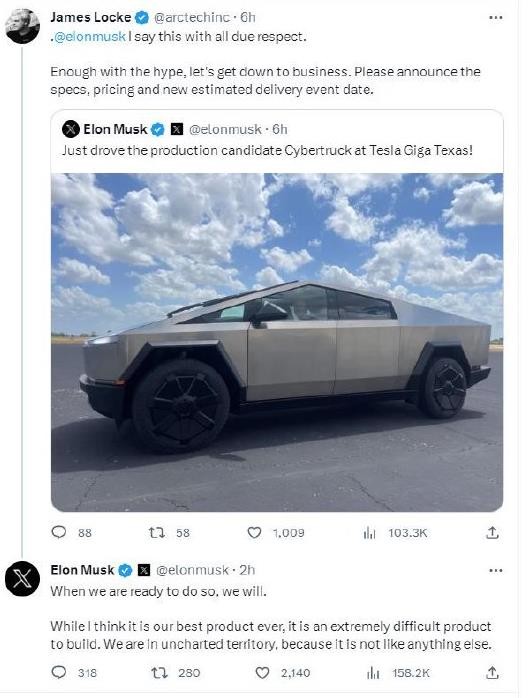 馬斯克試駕量產(chǎn)版Cybertruck 稱(chēng)其為有史以來(lái)最好產(chǎn)品 15:02:29