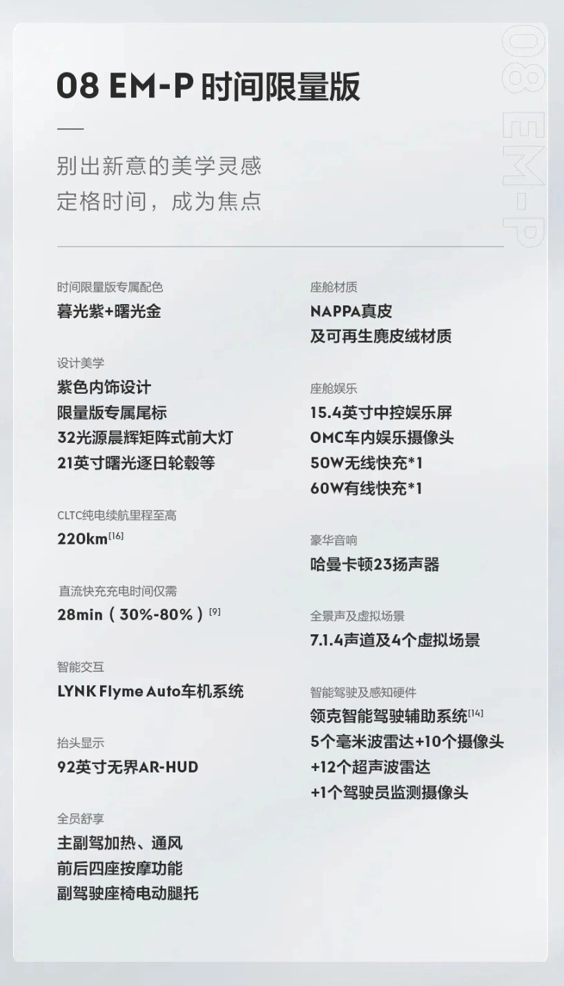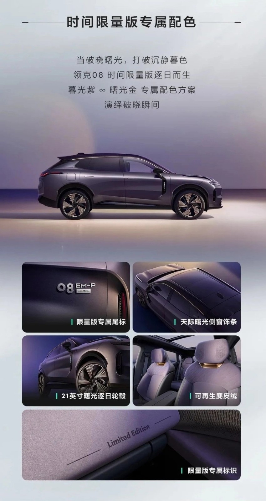 此外,時(shí)間限量版擁有專(zhuān)屬暮光紫 ∞ 曙光金配色,搭載專(zhuān)屬尾標、21 英寸曙光逐日輪轂等。