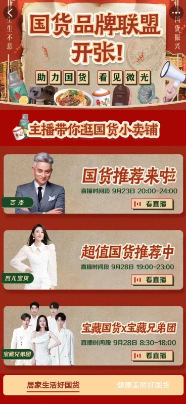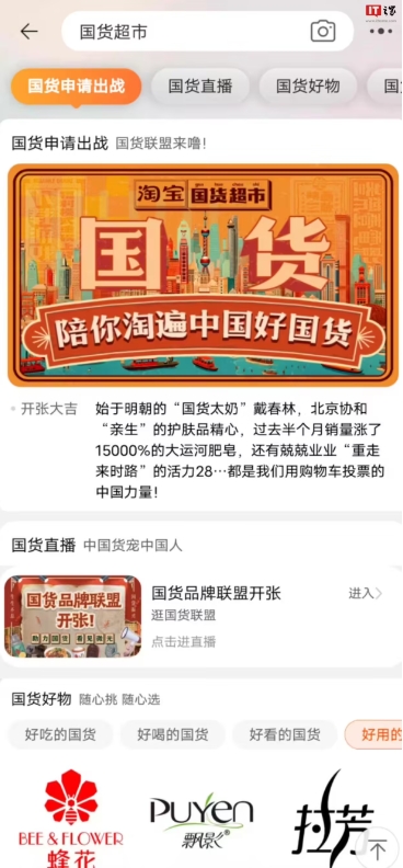 淘寶上線(xiàn)“國貨超市”,包含華為、小米、海爾、vivo、TCL 等品牌,商品涵蓋手機、家電、日用品、食品、美妝等。