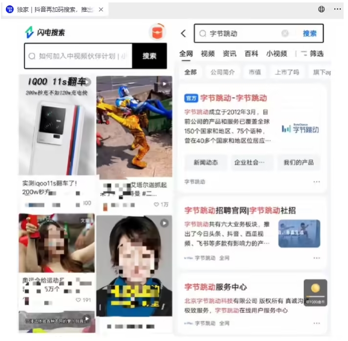 實(shí)測發(fā)現,“閃電搜索”的搜索結果由頭條搜索提供,第一印象類(lèi)似于阿里的夸克搜索,看起來(lái)并沒(méi)有太多特殊的地方。