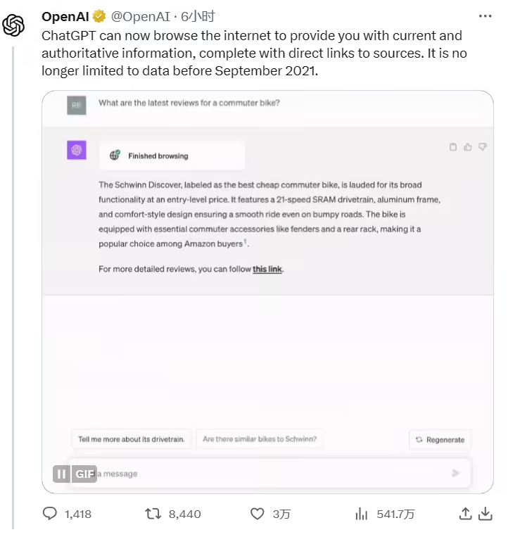 此外,Bing 搜索也集成到了 OpenAI 的 ChatGPT 中。OpenAI 今日在其 X 賬號宣布,ChatGPT 現在可以瀏覽互聯(lián)網(wǎng)了,由微軟必應提供支持,并提供直接來(lái)源鏈接,ChatGPT 不再局限于 2021 年 9 月之前的數據了。
