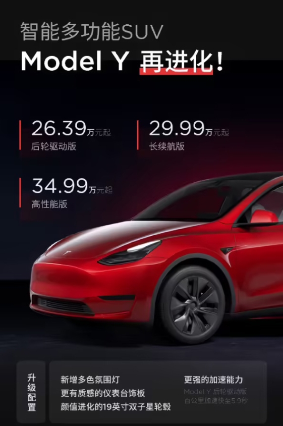10 月 1 日,特斯拉宣布 Model Y 汽車(chē)迎來(lái)升級,新增多色氛圍燈、全新儀表臺飾板等,百公里加速提升至 5.9 秒,而且依然維持在 26.39 萬(wàn)元。