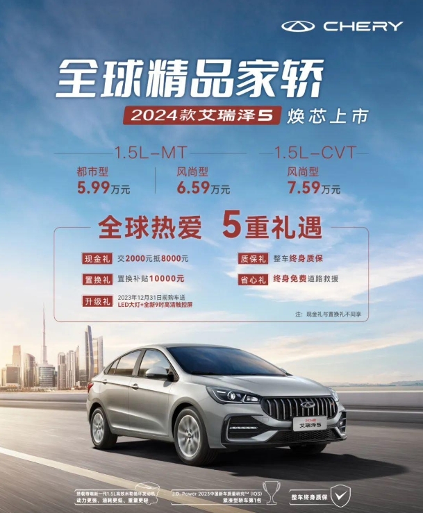 新車(chē)定位“全球精品家轎”,造型、動(dòng)力、配置升級,主打性?xún)r(jià)比。2024 款艾瑞澤 5 還為用戶(hù)帶來(lái)五重禮遇:
