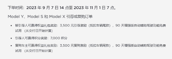 本期引薦試駕、引薦購車(chē)和復購獎勵于 2023 年 11 月 1 日 7 點(diǎn)開(kāi)始,所有獎勵內容將于 2023 年 12 月 31 日 24 點(diǎn)結束。