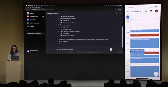 OpenAI工作人員Jessica shay現場(chǎng)演示了利用GPT Builder構建一個(gè)能與行程表互動(dòng)的 GPTs。并以對話(huà)的形式命令 GPT 給 Sam Altman 發(fā)信息, Altman也在現場(chǎng)接收到了這條信息。