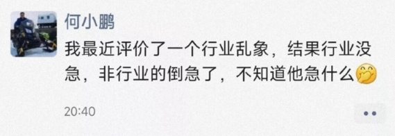 小鵬汽車(chē) CEO、董事長(cháng)何小鵬在朋友圈發(fā)文:“我最近評價(jià)了一個(gè)行業(yè)亂象,結果行業(yè)沒(méi)急,非行業(yè)的倒急了,不知道他急什么。”