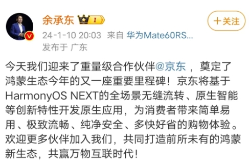 華為常務(wù)董事、終端業(yè)務(wù)CEO、智能汽車(chē)解決方案BU董事長(cháng)余承東在微博發(fā)文稱(chēng):“今天我們迎來(lái)了重量級合作伙伴京東,奠定了鴻蒙生態(tài)今年的又一座重要里程碑!”