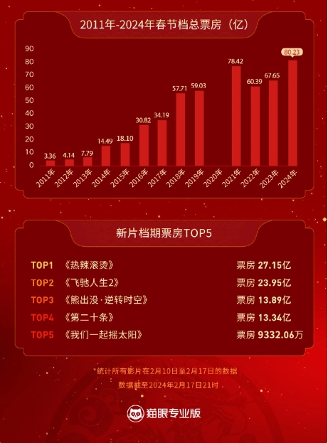 據貓眼專(zhuān)業(yè)版,截至 2 月 17 日 21 時(shí),2024 年春節檔新片總票房(含預售)突破 80.23 億元,超過(guò)歷史最高(注:2021 年春節檔)票房 78.42 億元,刷新了中國影史春節檔票房的新紀錄。