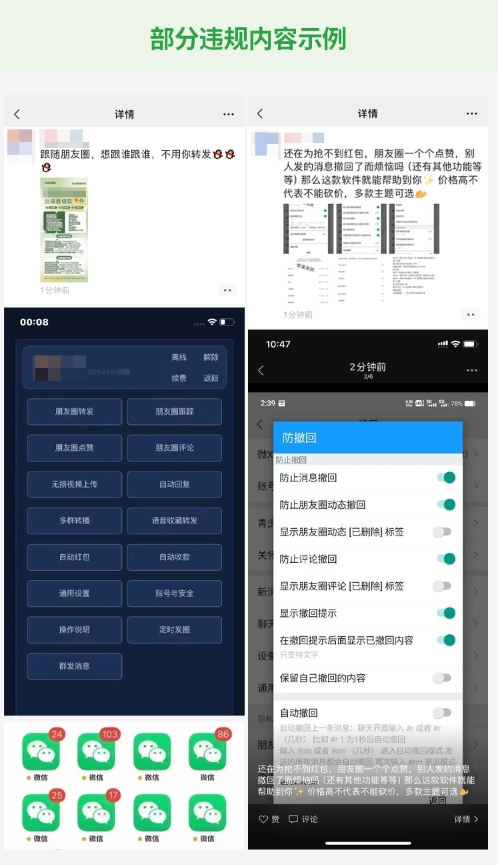 公告稱(chēng),用戶(hù)在使用微信軟件的過(guò)程中不得進(jìn)行影響用戶(hù)體驗、侵犯騰訊知識產(chǎn)權、危及平臺安全、損害他人權益的行為。根據《微信個(gè)人賬號使用規范》規定,微信明確禁止使用各類(lèi)外掛。但近期發(fā)現,有部分用戶(hù)存在多次違規使用外掛軟件,或在朋友圈發(fā)布外掛售賣(mài)信息的行為。對此,微信安全團隊進(jìn)行了專(zhuān)項清理,并將持續加大清理力度。